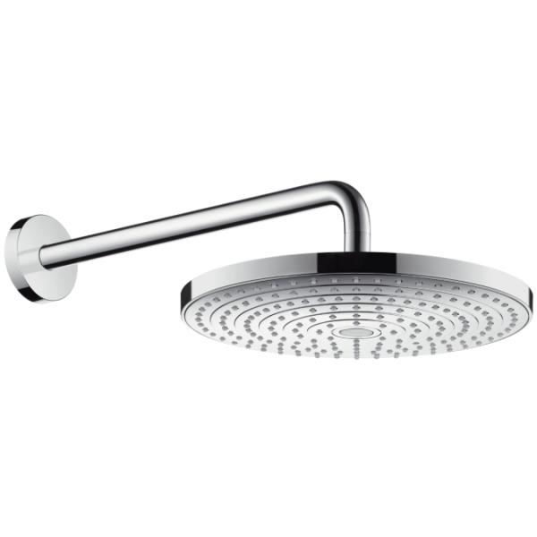hansgrohe Raindance Select S 300 2jet - Krom Nyd brusefornøjelsen XXL – forkæl dig selv med en stor designhovedbruser med to regnstråletyper! Stor regnbruser med 2 stråletyper med et tryk på en knap hansgrohe hovedbruseren Raindance Select S 300 2jet er med sin lange bruserbøjning (390 mm) ideel til problemløs modernisering af større bruseområder. Skal vægmonteres. Brusehovedet i storformat sikrer en drøm af en bruseoplevelse med 2 stråletyper, der indhyller hele kroppen i en bred bruseregn. Rain-strålen frisker dig op: den beroligende RainAir-stråle forkæler med store, lufttilførte dråber. Select-knappen bruges til at skifte mellem strålerne: Knappen er placeret midt på stråleskiven. Ved hjælp af et kugleled kan hovedets vinkel justeres. Regnbruserens runde, enkle design er et blikfang i ethvert badeværelsesmiljø. Den harmonerer med mange hansgrohe brusere og armaturer i moderne formsprog. Hovedbruseren kan for eksempel bedst kombineres med en Raindance (Select) håndbruser med rund, flad stråleskive. Stråleskive og bruserbøjning er i metal og fuldt forkromede. Det gør dem robuste, skinnende blanke og rengøringsvenlige (fås også i variant med hvid stråleskive). Et perfekt strålebillede opnås ved at fjerne kalkaflejringer med en finger (QuickClean). Stråleskiven kan fjernes. Andre egenskaber: