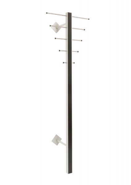Hoigaard ST-1 stumtjener - Sort Hoigaards ikoniske stumtjener monteres på væggen og er en stilfuld opbevaringsmulighed til overtøjet. Stumtjeneren monteres med to arme på væggen, men disse er nærmest usynlige, når stumtjeneren først er monteret. Overtøj og tasker kan hænges på 5 knager på hver side. Ikke nok med at stumtjeneren er praktisk, så er den også en spændende, designmæssig tilføjelse - der naturligvis går godt hånd-i-hånd med resten af Hoigaards sortiment. Stumtjeneren er lavet af en kombination af massivt, lakeret træ og eloxeret aluminium, hvor knagerne/stængerne er af rustfrit stål. Specifikationer: