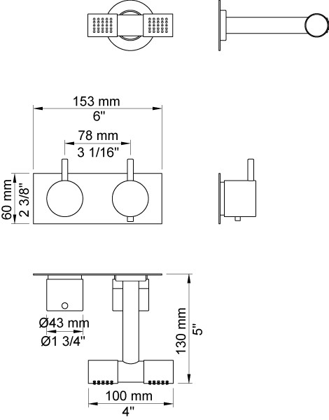 Vola Indbygningstermostat med løs afgangsmuffe Dobbelt hovedbruser, 115 mm Krom 16 3/4''RG/PEX |